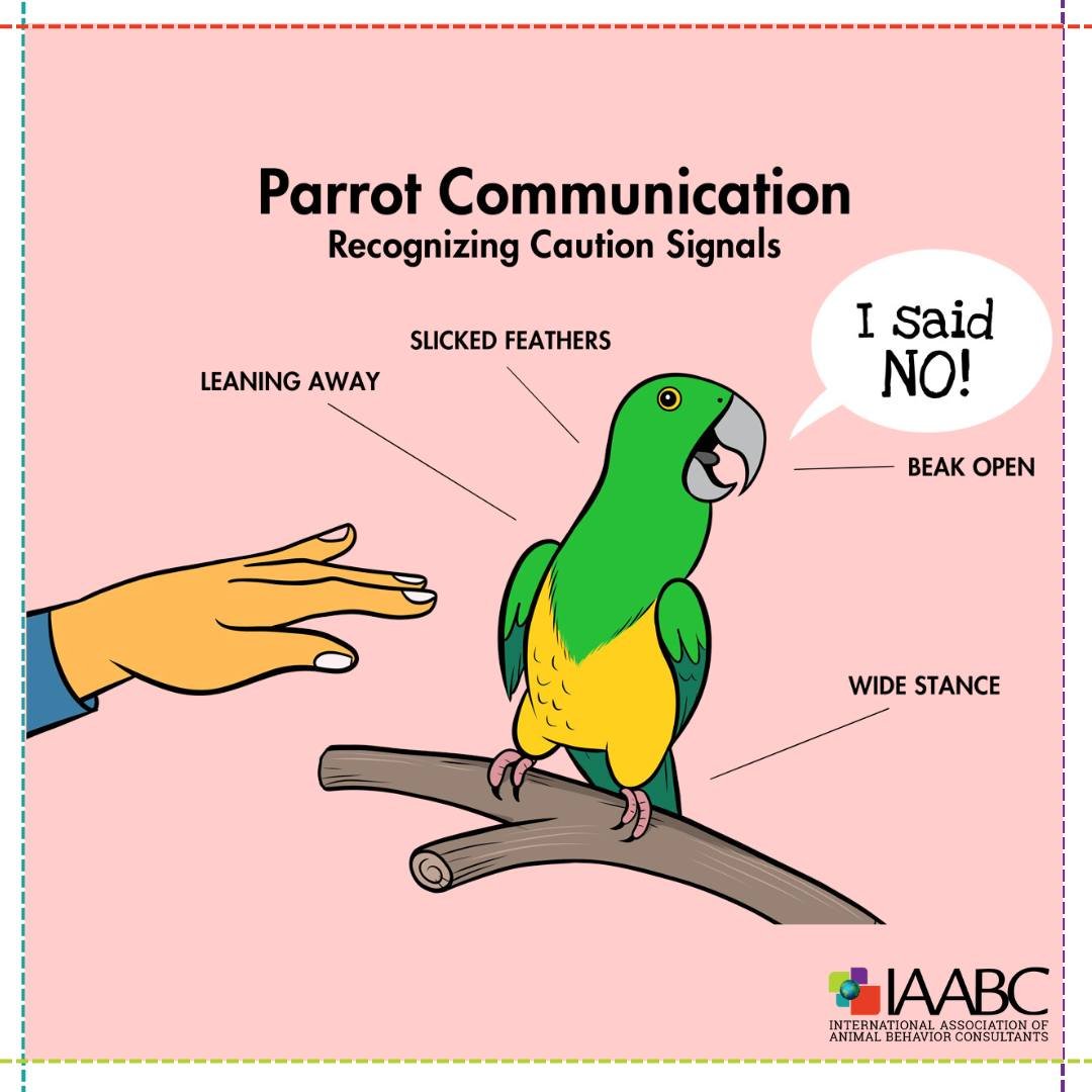 The IAABC (International Association of Animal Behavior Consultants) created a wonderful image called "Parrot Communication" that depicts uncomfortable, unclear, and the onset of a fear-response body language.